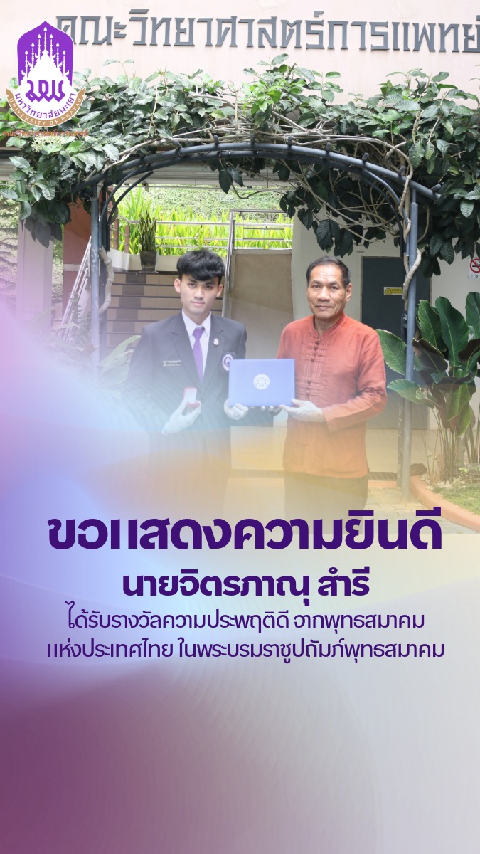นับเป็นอีกหนึ่งความภาคภูมิใจอันยิ่งใหญ่ของคณะวิทยาศาสตร์การแพทย์ มหาวิทยาลัยพะเยา เมื่อ นายจิตรภาณุ สำรี นิสิตจากหลักสูตรโภชนาการและการกำหนดอาหาร ได้รับการคัดเลือกให้เข้ารับ "รางวัลความประพฤติดี" ประจำปีพุทธศักราช 2568 ซึ่งเป็นรางวัลอันทรงเกียรติจากพุทธสมาคมแห่งประเทศไทย ในพระบรมราชูปถัมภ์ รางวัลดังกล่าวเป็นเครื่องหมายเชิดชูเกียรติคุณงามความดี ที่มอบให้แก่เยาวชนผู้เพียบพร้อมด้วยคุณธรรม จริยธรรม มีความประพฤติเรียบร้อย และเป็นแบบอย่างที่ดีงามแก่สังคม การที่นายจิตรภาณุ สำรี ได้รับรางวัลนี้ ไม่เพียงแต่สะท้อนถึงความมุ่งมั่นในการปฏิบัติตนเป็นคนดีของตัวนิสิตเอง แต่ยังเป็นกระจกเงาที่สะท้อนคุณภาพของการบ่มเพาะบัณฑิตของคณะวิทยาศาสตร์การแพทย์ ที่ให้ความสำคัญกับการสร้างคนที่สมบูรณ์พร้อม ทั้งด้านวิชาการและคุณธรรม